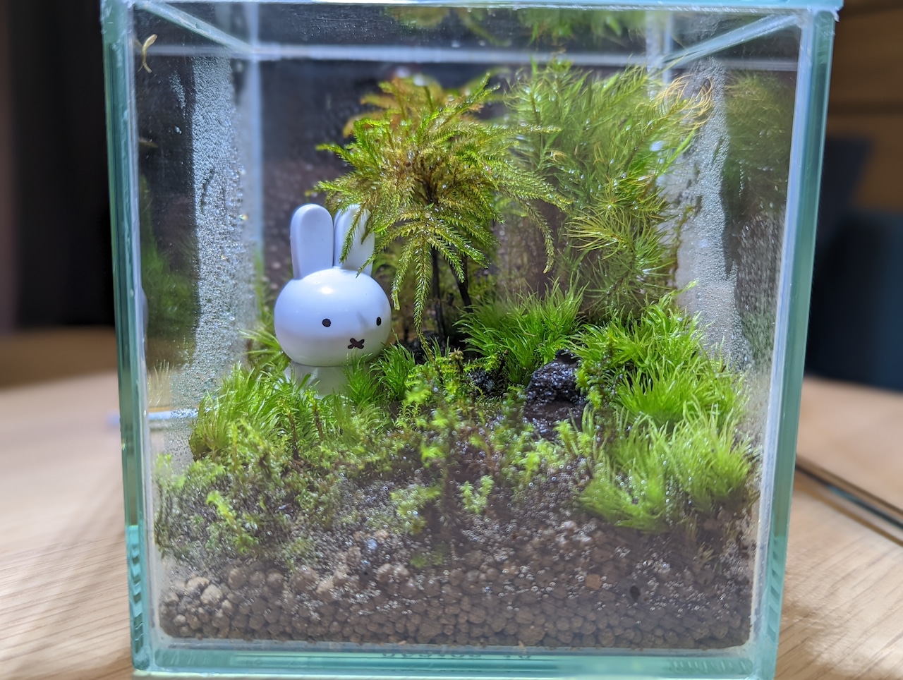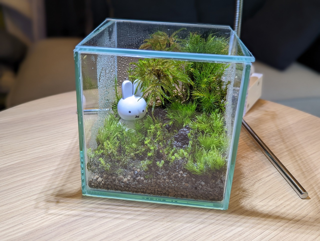 10cm x 10cm x 10cmの手のひらサイズの小さなコケリウム。ヒノキゴケの森の入口でコウヤノマンネングサの傘で雨宿り、の風景を表現しています。